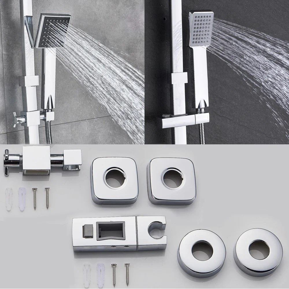 Showerhead: Ultrathin Style Head are Stainless Steel, Black Face and Grey Face Head are Plastic Material Handshower: Plastic Material Bracket: Plastic Material Shower rail Height adjustable 800--1200mm Installation hole distance: 15cm (13.5-17cm adjustable)